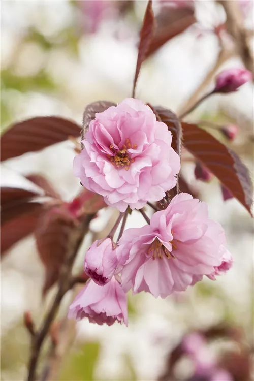 Die Japanische Nelkenkirsche 'Royal Burgundy'® (Prunus serrulata) ist ein ausladender, trichterförmiger Großstrauch mit dekorativen Früchten. Die rosafarbenen Blüten erscheinen von Ende April bis Anfang Mai. Zudem trägt die Japanische Nelkenkirsche 'Royal Burgundy'® dekorative, sommergrüne, eiförmige, purpurrote Blätter.