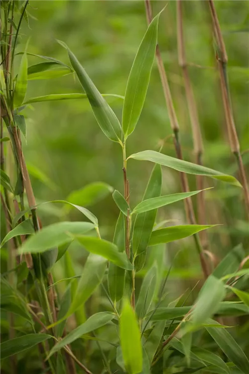 Die immergrünen Blätter des Gartenbambuses 'Super Jumbo'(s) sind hellgrün, lanzettlich.
