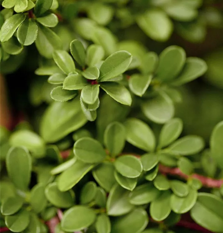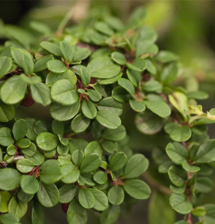 Die immergrünen Blätter der Teppichmispel sind dunkelgrün, rundlich, wechselständig.