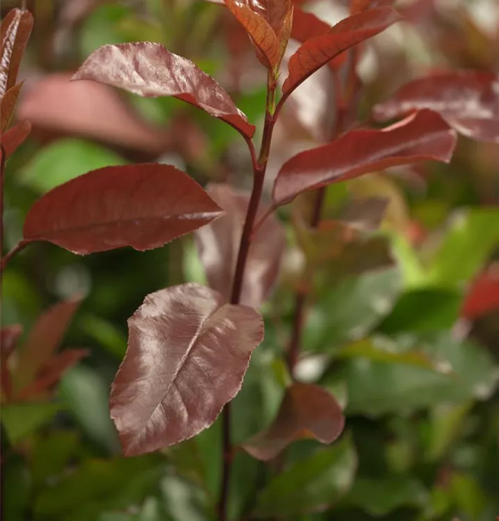 Die Glanzmispel (Photinia fraseri) eine strauchartige Gartenpflanze, die, je nach Sorte, Blüten in verschiedenen Farben hervorbringt. Besonders dekorativ ist der kupferbraune Jungaustrieb. An einem sonnigen bis halbschattigen Standort mit durchlässigem Boden erreicht sie gewöhnlich eine Höhe von ca. 6 m und wird ca. 6 m breit.