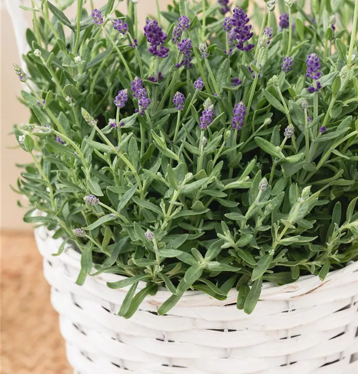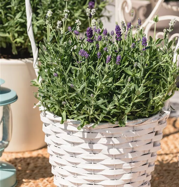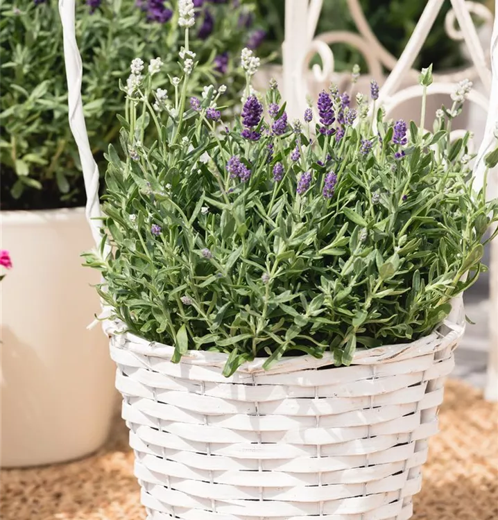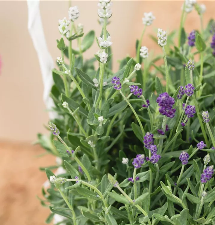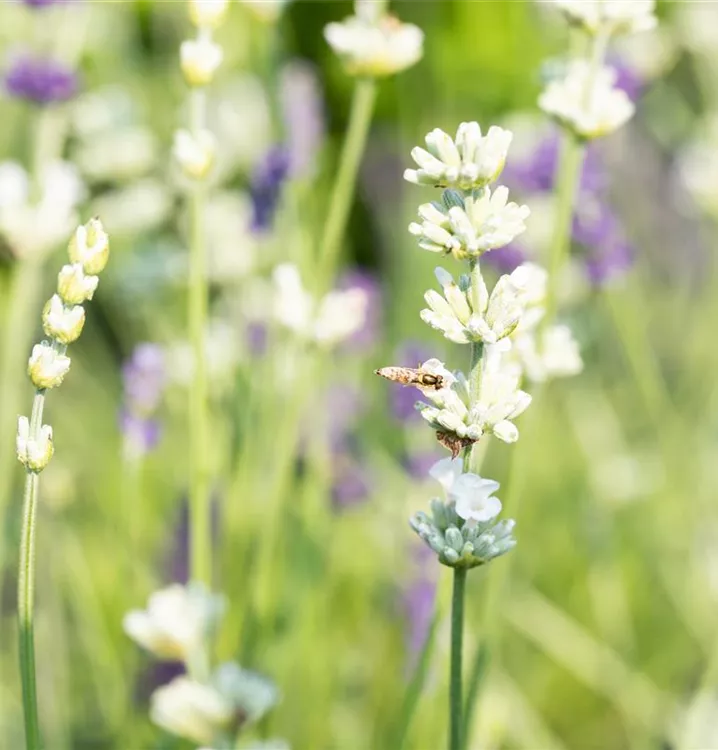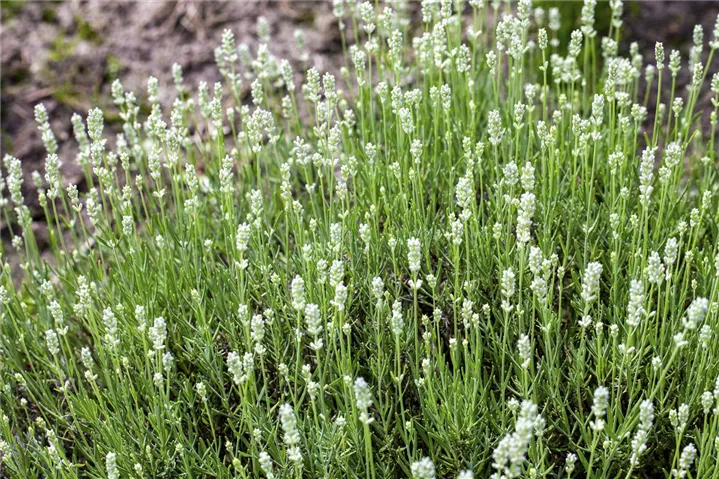 Der Echte Lavendel (Lavandula angustifolia) ist eine buschige immergrüne Staude, die von Juni bis Juli weiße, rachenförmige, in Rispen angeordnete Blüten mit einem angenehmen Duft bildet. An einem sonnigen Standort mit durchlässigem, nährstoffreichem Boden erreicht er gewöhnlich eine Höhe von ca. 80 cm und wird ca. 50 cm breit. Der Echte Lavendel ist gut frostverträglich.