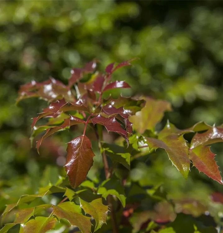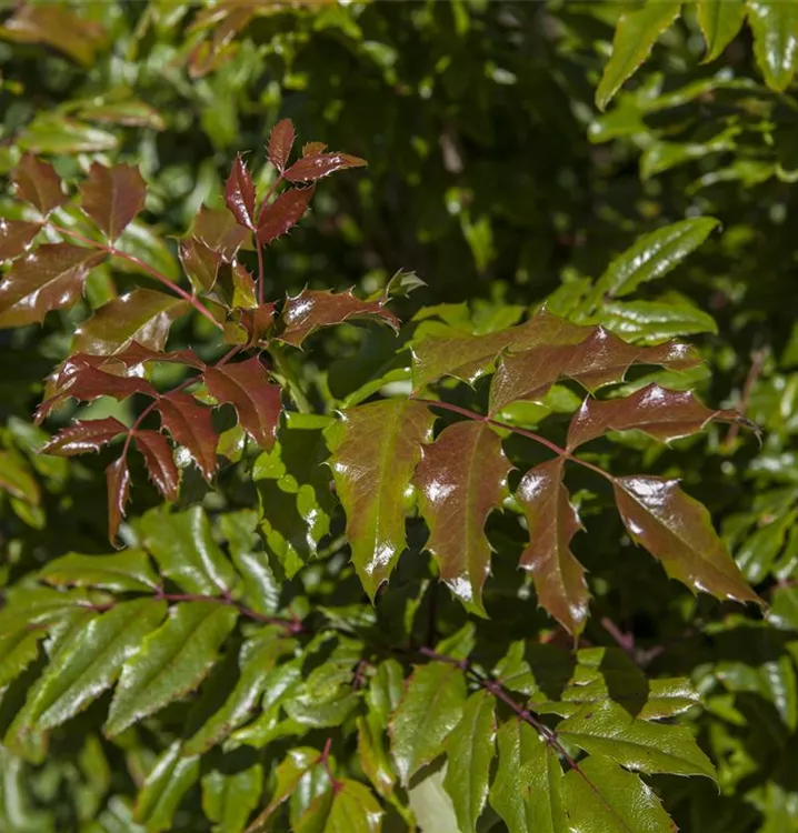 Die immergrünen Blätter der Gewöhnliche Mahonie sind dunkelgrün, gefiedert, wechselständig, gezähnt. Diese sind etwa 2 - 3 cm groß. Kupferbrauner Austrieb. Mit seinem rot-braunen Laub setzt sie schöne Akzente im Winter.