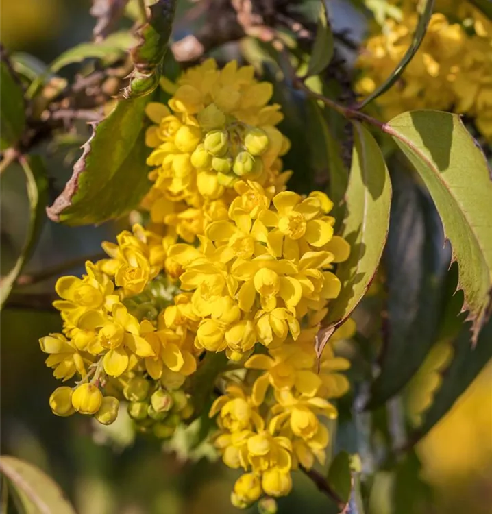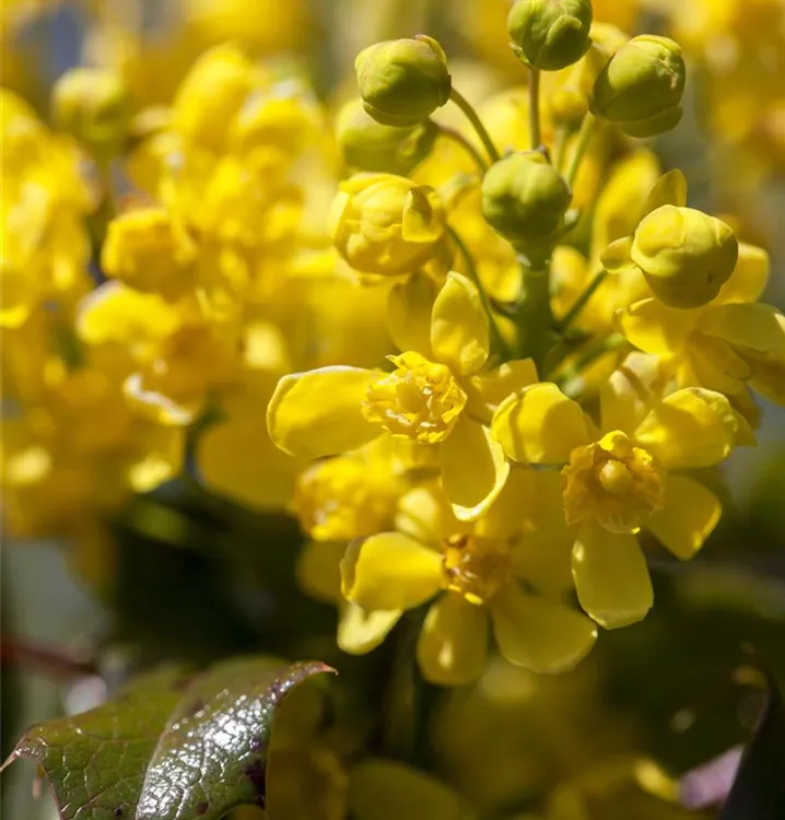 Die gelben Blüten der Gewöhnlichen Mahonie erscheinen in Trauben von April bis Mai. Diese sind angenehm duftend.