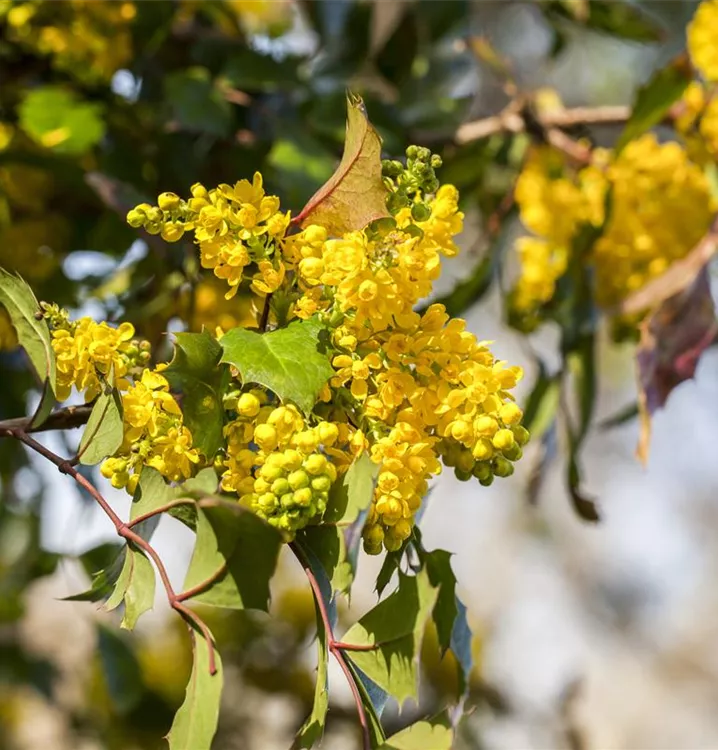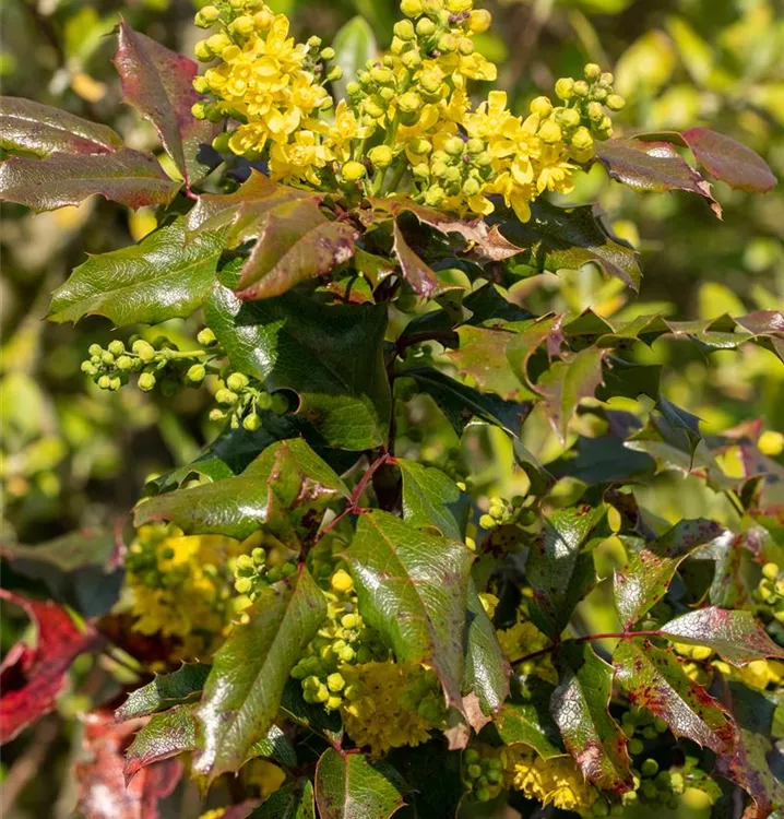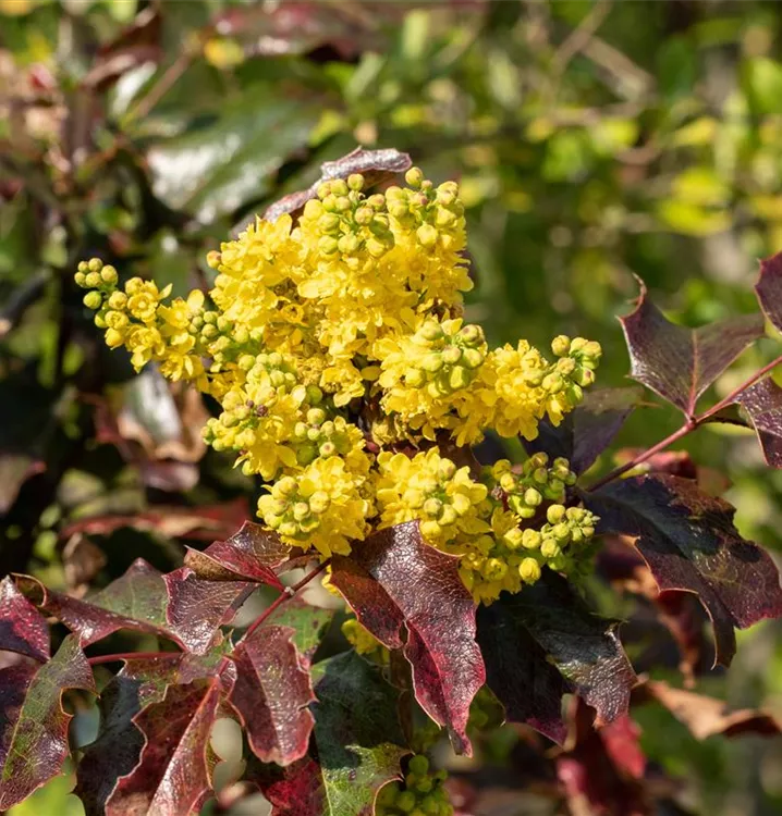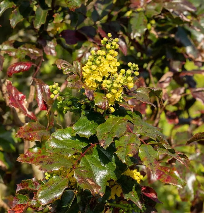 Die Gewöhnliche Mahonie (Mahonia aquifolium) ist ein buschiger, dichter Kleinstrauch mit dekorativen, blau-grauen, ovalen Früchten. Die Blüten erscheinen je nach Sorte in verschiedenen Farben. Auch der kupferbraune Austrieb ist sehr schön.