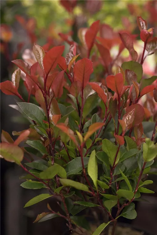 Die immergrünen Blätter der Glanzmispel 'Little Red Robin' sind dunkelgrün, lanzettlich, glänzend. Roter Austrieb.