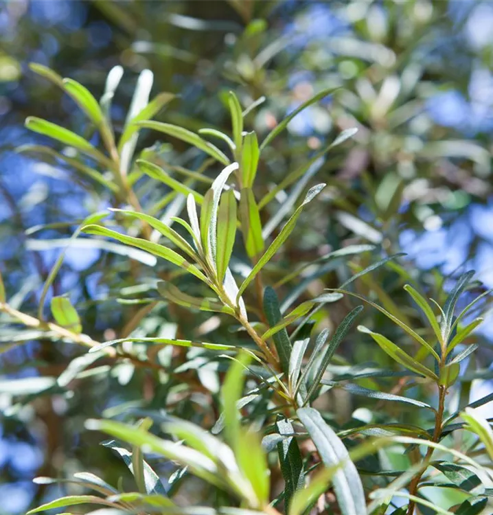 Die sommergrünen Blätter des Sanddorns sind grau-grün, lanzettlich, wechselständig. Diese sind etwa 2 - 5 cm groß. Lange haftend.