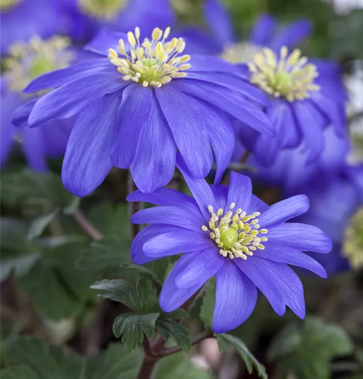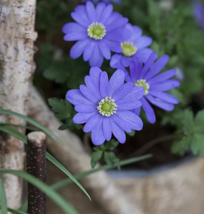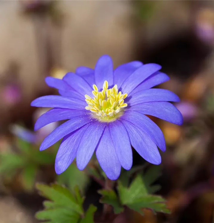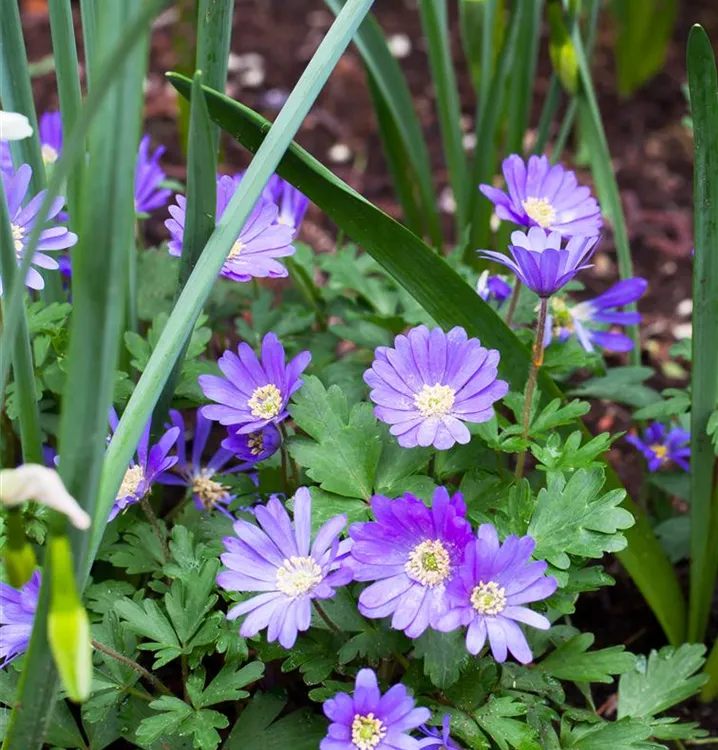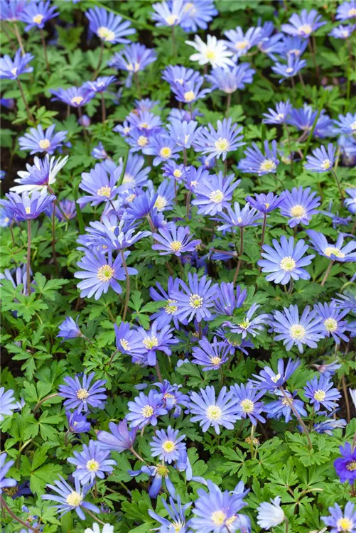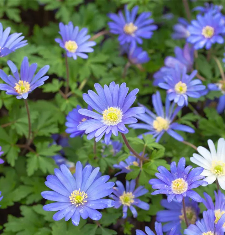 Das Strahlen-Windröschen (Anemone blanda) bringt ansehnliche, blaue Blüten von März bis Mai hervor. Bevorzugt wird ein durchlässiger, humoser, kalkfreier Boden in sonniger bis halbschattiger Lage. Die rhizombildende, horstbildende Staude erreicht gewöhnlich eine Höhe von 10 - 15 cm und wird bis zu 10 cm breit.