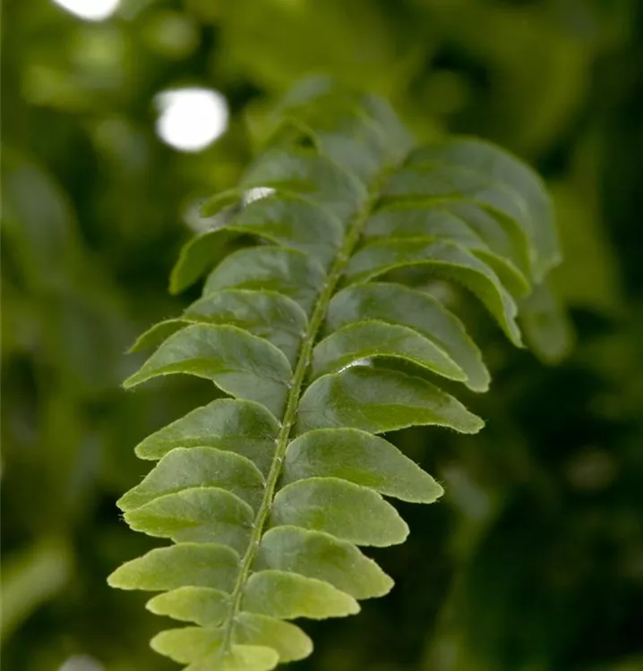 Die immergrünen Blätter des Schwertfarns sind mittelgrün, gefiedert.