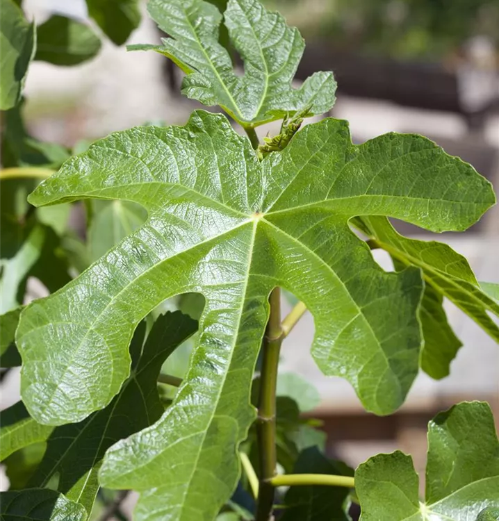 Die sommergrünen Blätter der Echte Feige sind dunkelgrün, glänzend, gelappt.