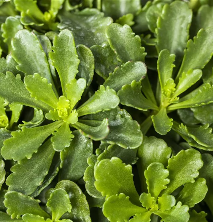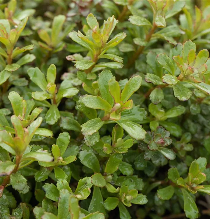 Die wintergrünen Blätter des Reichblühenden Garten-Fettblatts 'Weihenstephaner Gold' sind mittelgrün, dickfleischig.