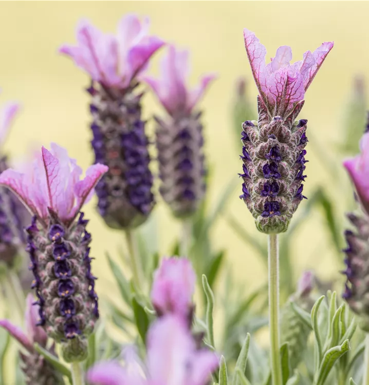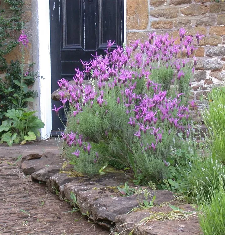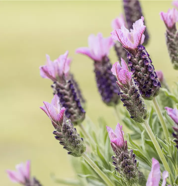 Der Garten-Schopf-Lavendel (Lavandula stoechas) ist eine buschige wintergrüne Staude, die von Juli bis Oktober rosafarbene Blüten mit einem angenehmen Duft bildet. An einem sonnigen Standort mit durchlässigem, saurem Boden erreicht er gewöhnlich eine Höhe von ca. 80 cm und wird ca. 30 cm breit.