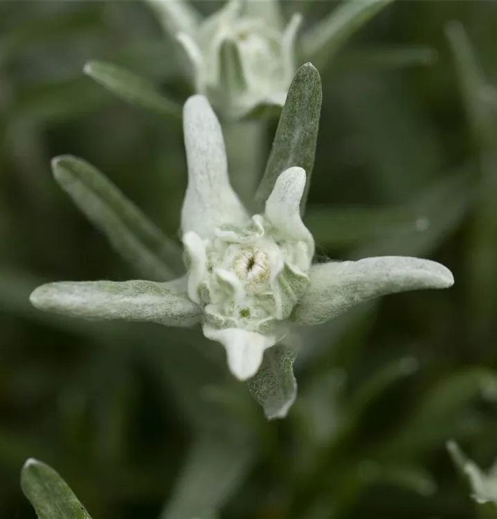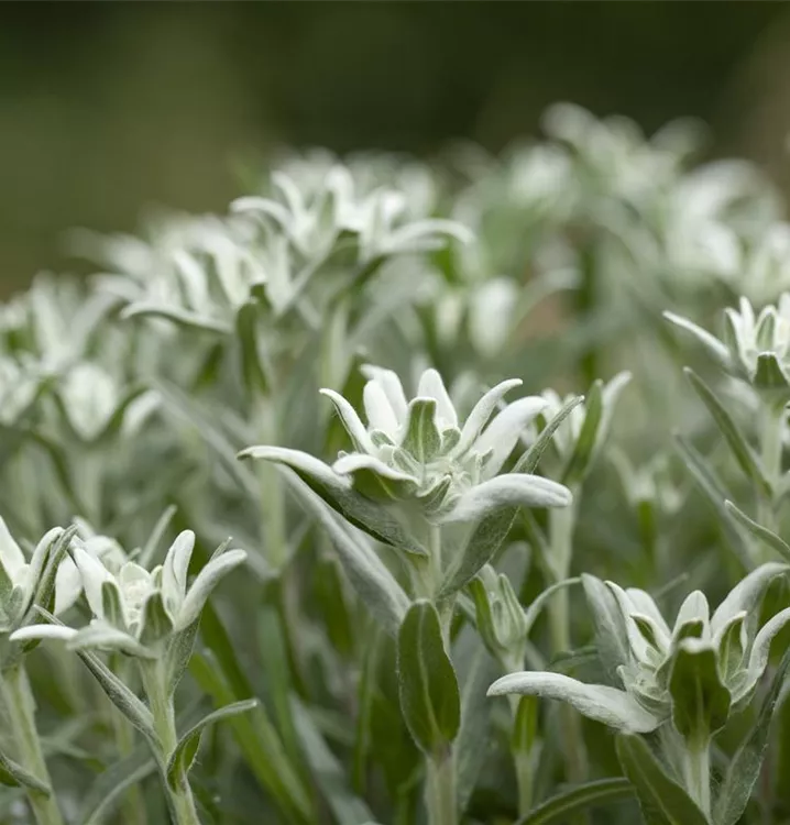 Leontopodium alpinum bildet sternförmige, silberweiße Blüten ab Juni.
