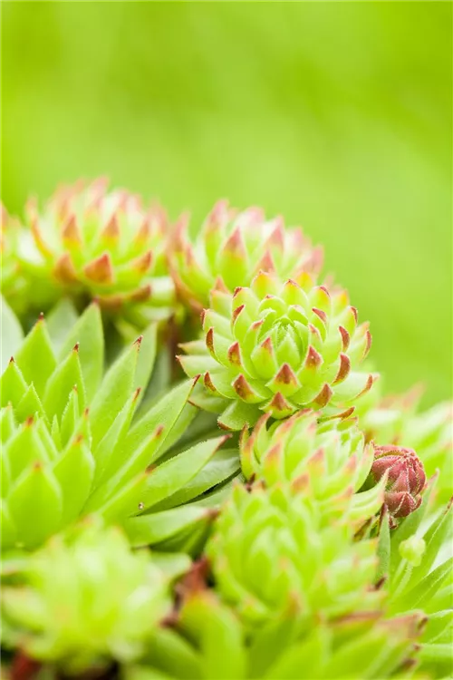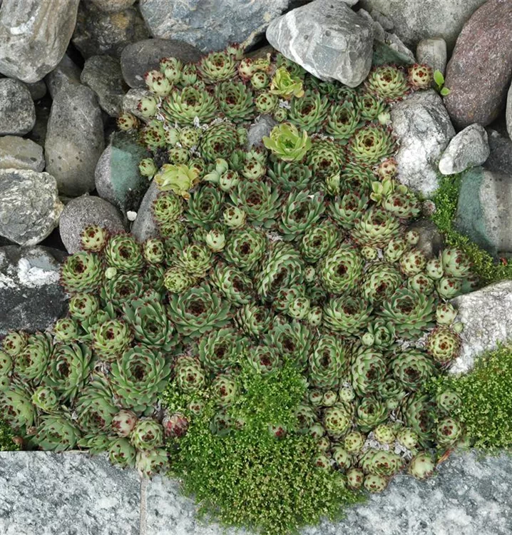 Die Dach-Hauswurz (Sempervivum tectorum) zählt zu den pflegeleichten Pflanzen und besitzt mittelgrüne, dickfleischige, lanzettliche Blätter. Ihre körbchenartigen Blüten erscheinen in Rispen im Zeitraum von Juni bis Juli.Diese polsterbildende, rosettenartige und ausläuferbildende Pflanze gedeiht am besten an einem sonnigen Standort.
