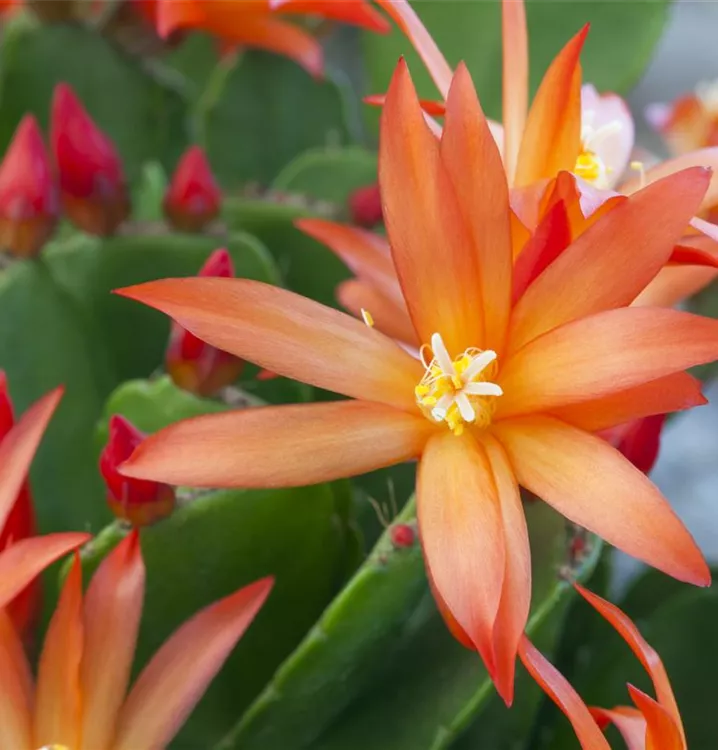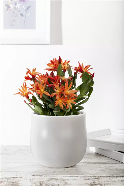 Der Osterkaktus (Rhipsalidopsis gaertneri) ist eine Pflanze mit mittelgrünen, eiförmigen, dickfleischigen, gekerbten Blättern. Die glockenförmigen Blüten erscheinen von Januar bis März. Diese überhängende Pflanze gedeiht am besten an einem sonnigen bis halbschattigen Standort.