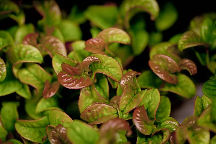 Die immergrünen Blätter der Traubenheide 'Curly Red'® sind dunkelgrün, lanzettlich, glänzend, wechselständig, gezähnt. Roter Austrieb. Mit seinem purpurroten Laub setzt sie schöne Akzente im Winter.