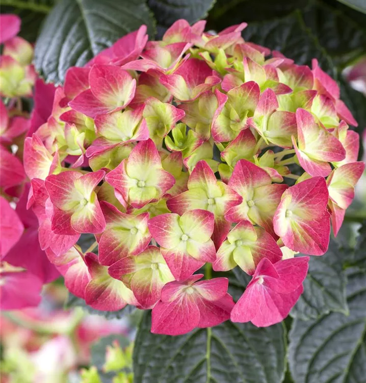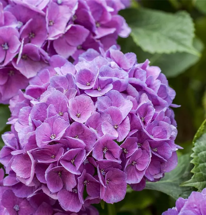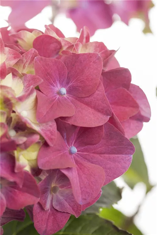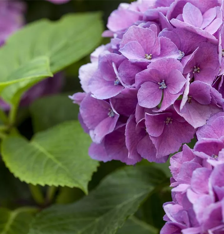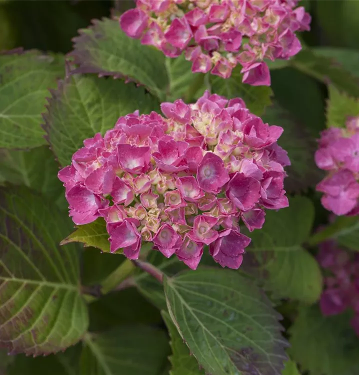 Die sommergrünen Blätter der Bauernhortensie sind mittelgrün, eiförmig, gesägt.