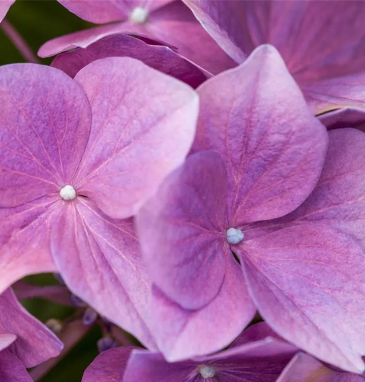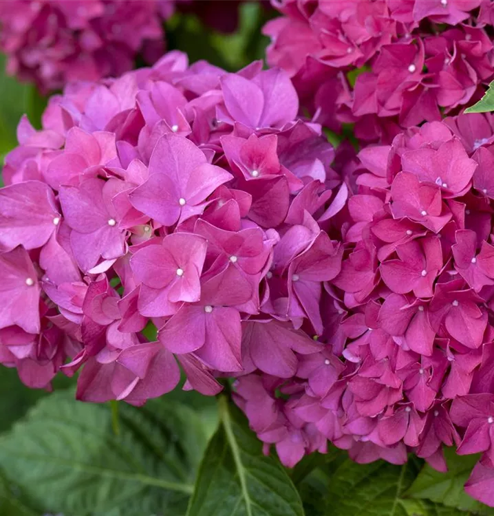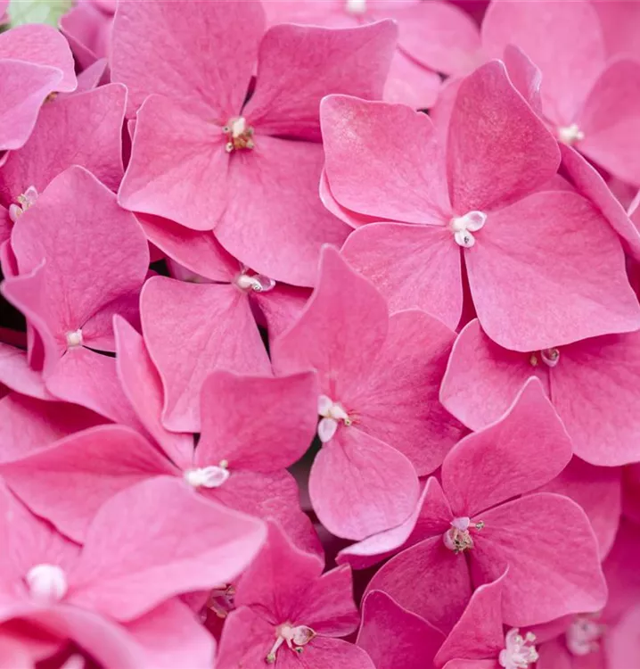 Die rosaroten, schalenförmigen Blüten der Bauernhortensie erscheinen in Dolden von Juni bis September.