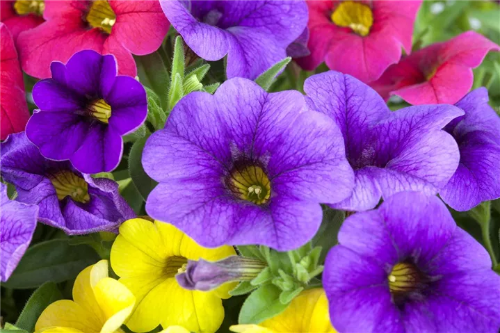 Calibrachoa 'Celebration® Karneval' bildet während der gesamten Saison zahlreiche trichterförmige, gelbe, violette, pinke Blüten.