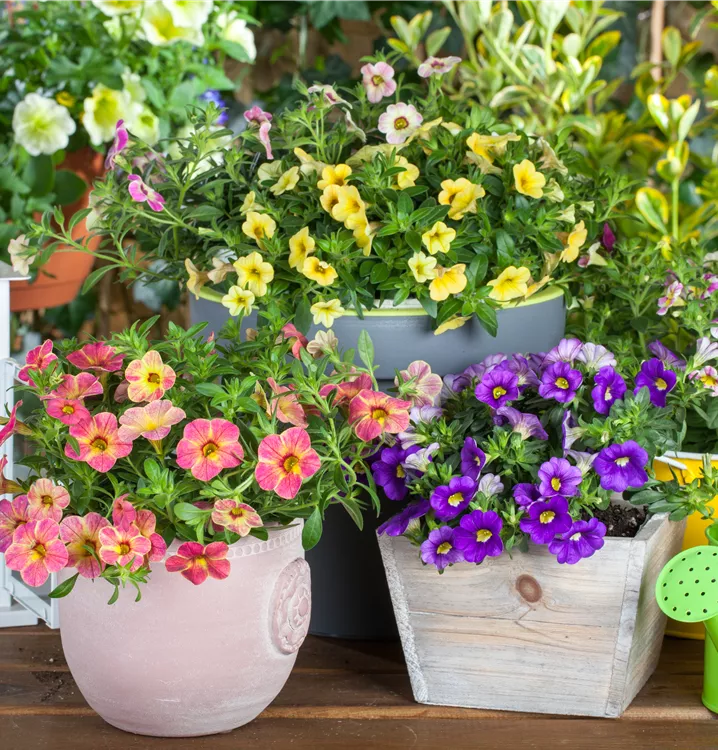 Das Zauberglöckchen 'Celebration® Karneval' (Calibrachoa) ist eine beliebte Pflanze für den Balkon. Die unzähligen Blüten erscheinen, je nach Sorte, in verschiedenen Farben die ganze Saison hindurch. Ein halbschattiger Standort und ein durchlässiges Substrat werden bevorzugt.