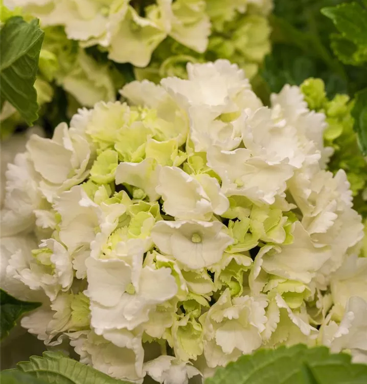 Die sommergrünen Blätter der Bauernhortensie sind mittelgrün, eiförmig, gesägt.