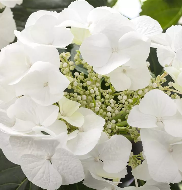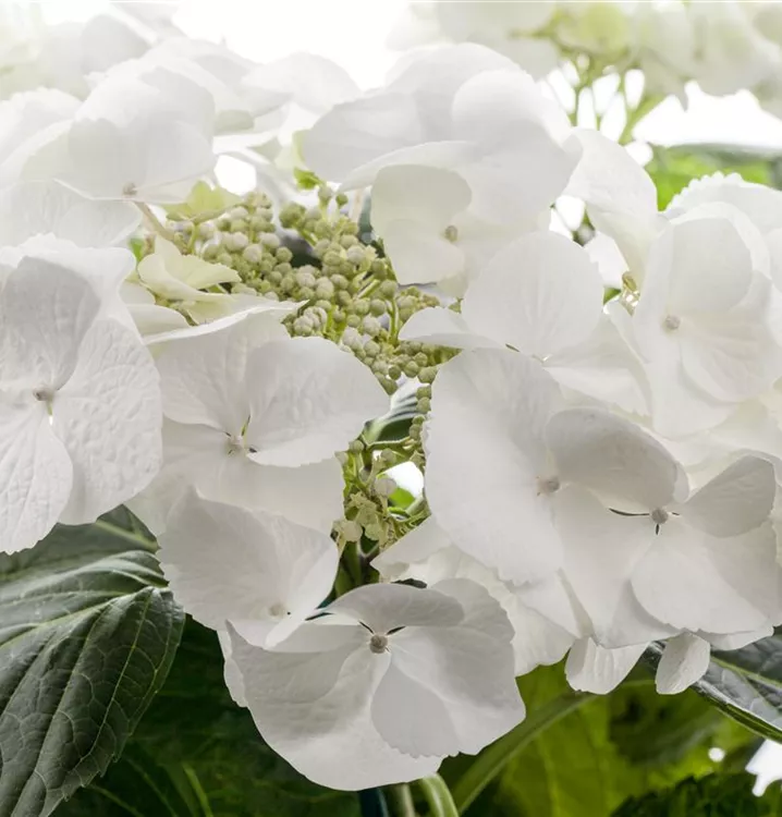 Die weißen, schalenförmigen Blüten der Bauernhortensie erscheinen in Dolden von Juni bis September.