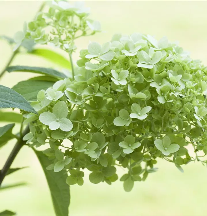 Die sommergrünen Blätter der Rispenhortensie sind mittelgrün, lanzettlich.