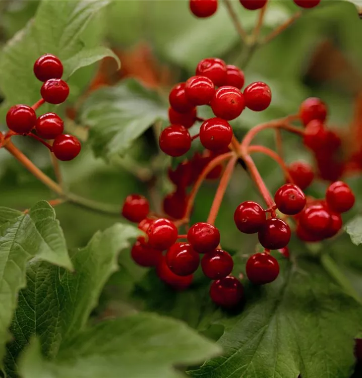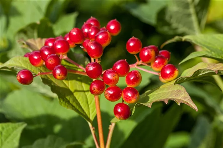 Besonders dekorativ sind die roten Steinfrüchte von Viburnum opulus. Diese erscheinen ab September.Haften sehr lange.