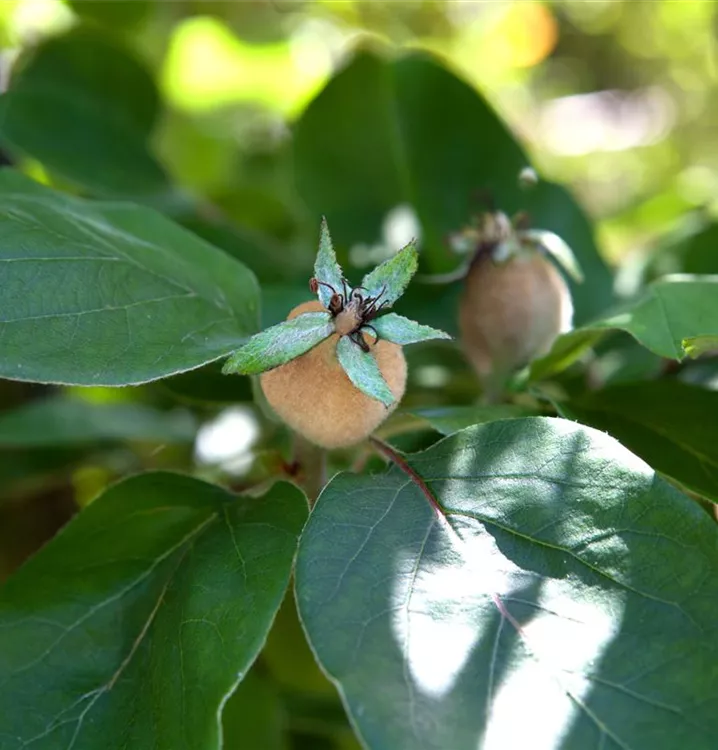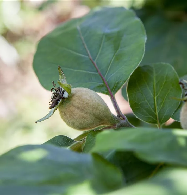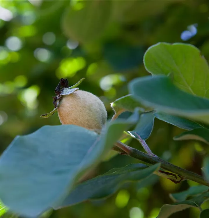 Die Echte Quitte (Cydonia oblonga) bildet goldgelbe Früchte. Sie haben einen süß-säuerlichen Geschmack. Für eine ertragreiche Ernte ab Oktober schaffen durchlässiger, nährstoffreicher Boden und ein sonniger bis halbschattiger Standort optimale Bedingungen. Auch ihre hellrosafarbenen Blüten sind eine schöne Erscheinung.