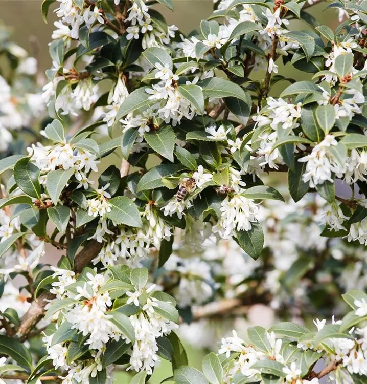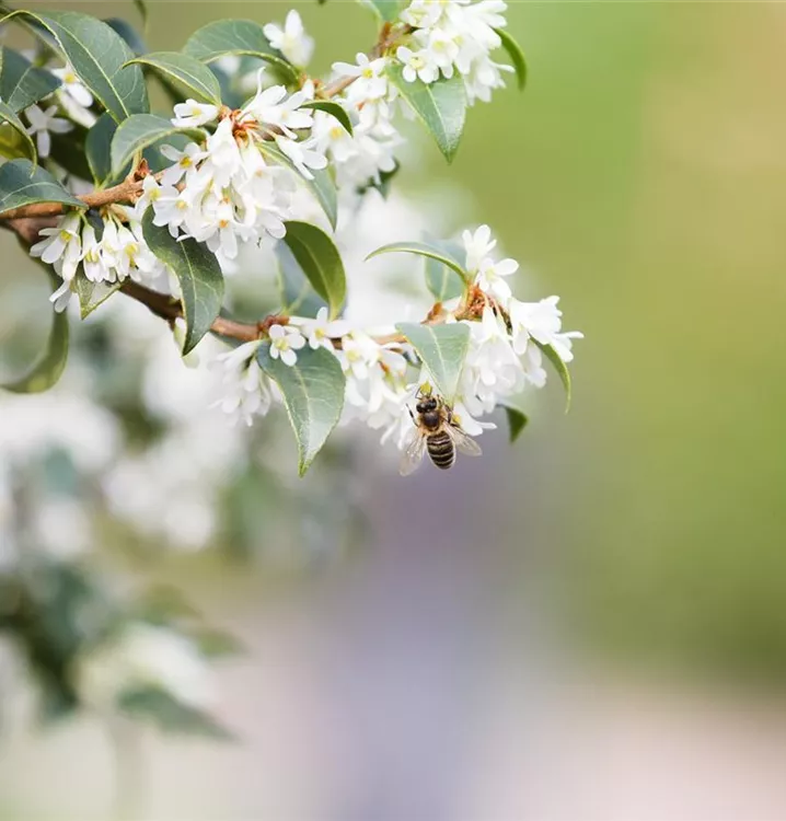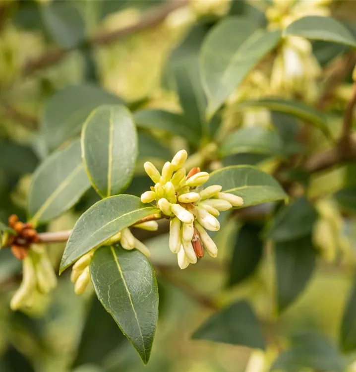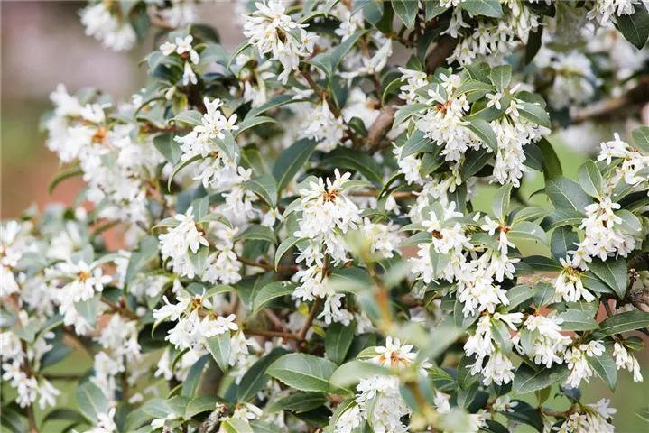 Die Burkwoods Duftblüte (Osmanthus burkwoodii) ein buschiger, breiter Großstrauch, der, je nach Sorte, Blüten in verschiedenen Farben hervorbringt. An einem halbschattigen bis schattigen, windgeschützten Standort mit durchlässigem, humosem Boden erreicht sie gewöhnlich eine Höhe von ca. 5 m und wird ca. 5 m breit.