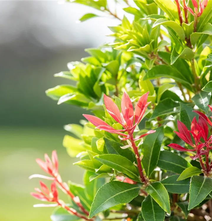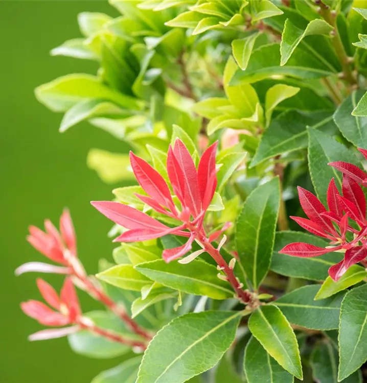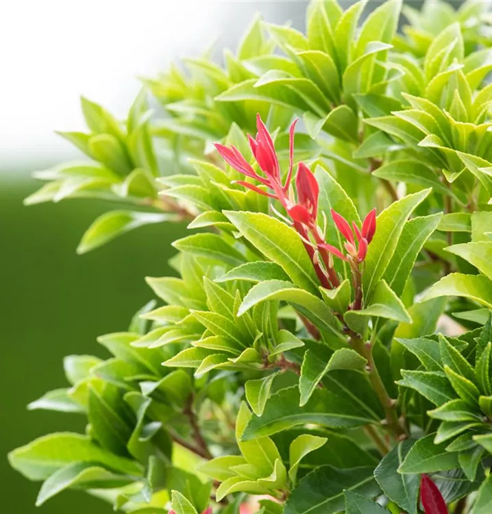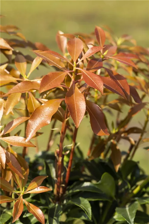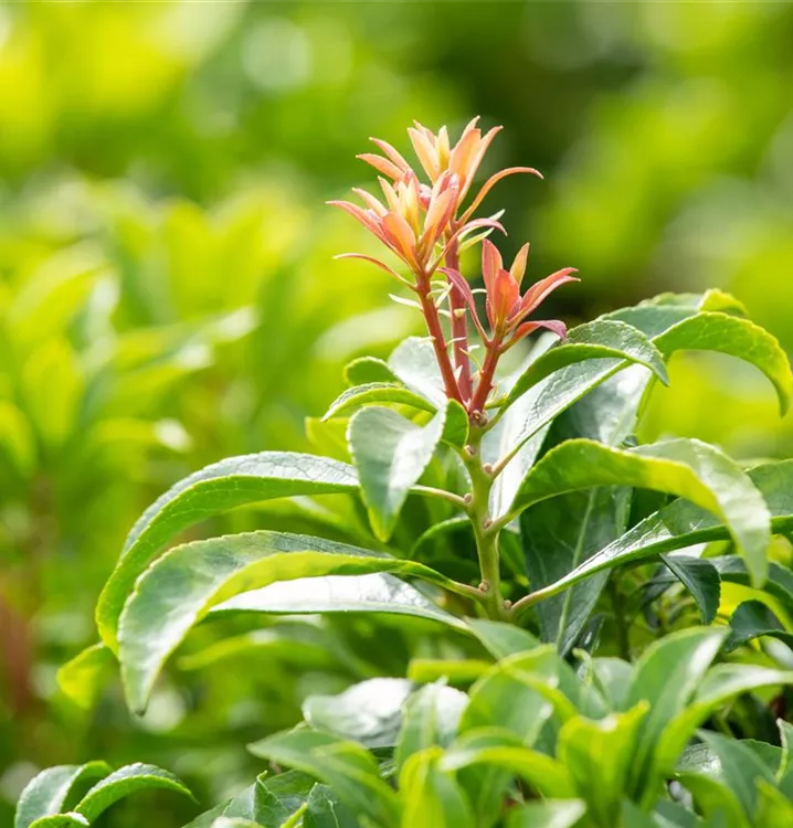Das Schattenglöckchen 'Mountain Fire' (Pieris japonica) ist ein buschiger, breiter, dichter Kleinstrauch, der weiße, in Rispen angeordnete Blüten hervorbringt. Sie erscheinen von März bis Mai. Besonders dekorativ ist der dunkelrote Jungaustrieb. An einem halbschattigen bis schattigen, windgeschützten Standort mit humosem, nährstoffreichem Boden erreicht es gewöhnlich eine Höhe von ca. 1,3 m und wird ca. 1 m breit.