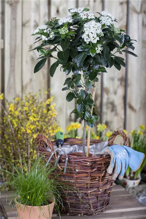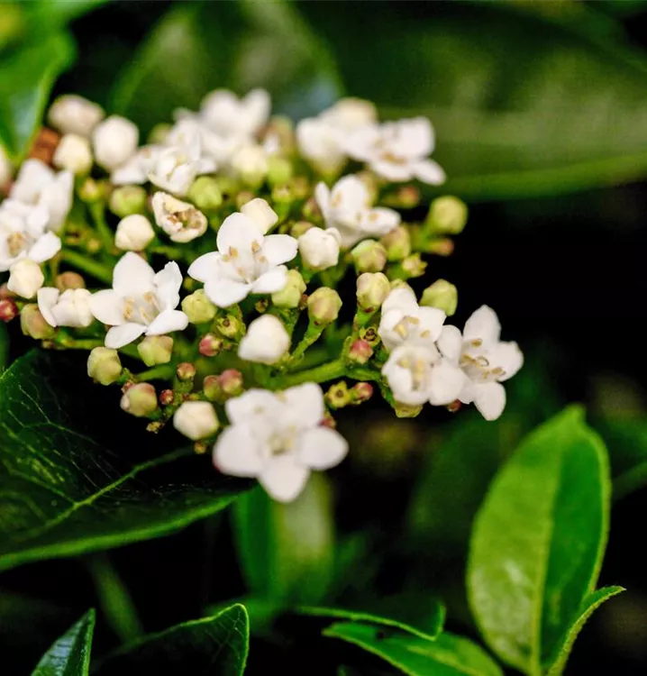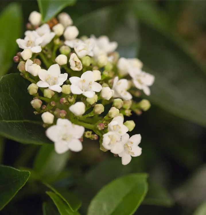 Der Lorbeer-Schneeball (Viburnum tinus) ist ein aufrechter, breiter Strauch mit dekorativen, blau-grauen, ovalen Früchten. Die Blüten erscheinen je nach Sorte in verschiedenen Farben.
