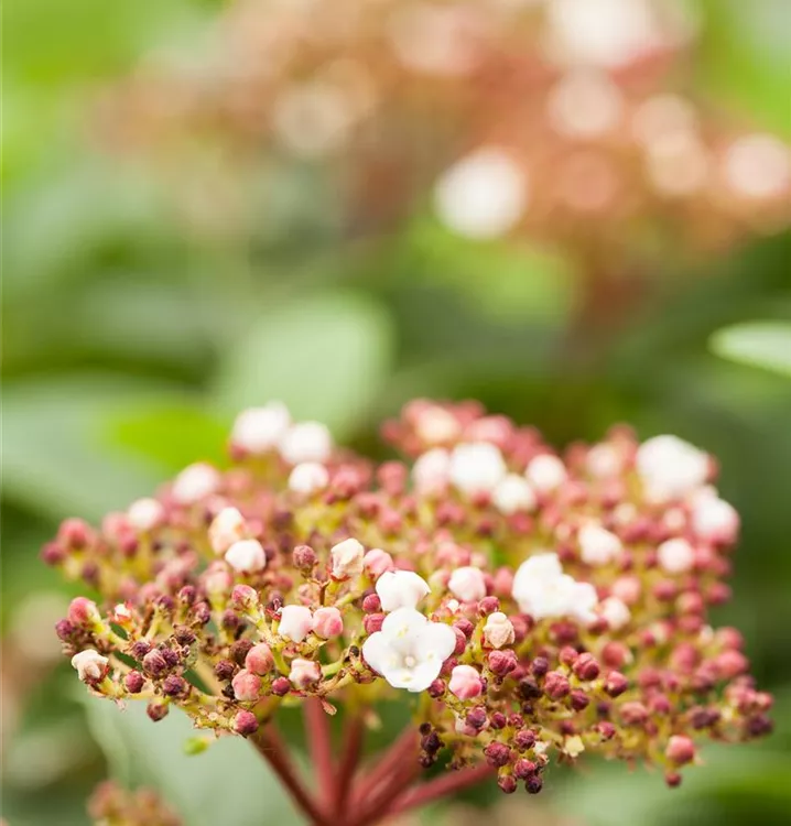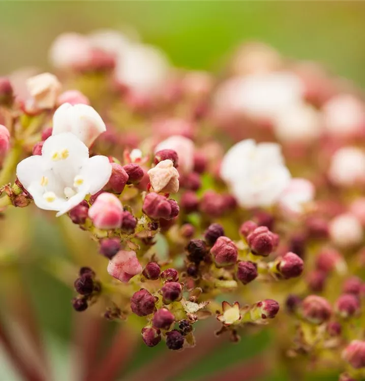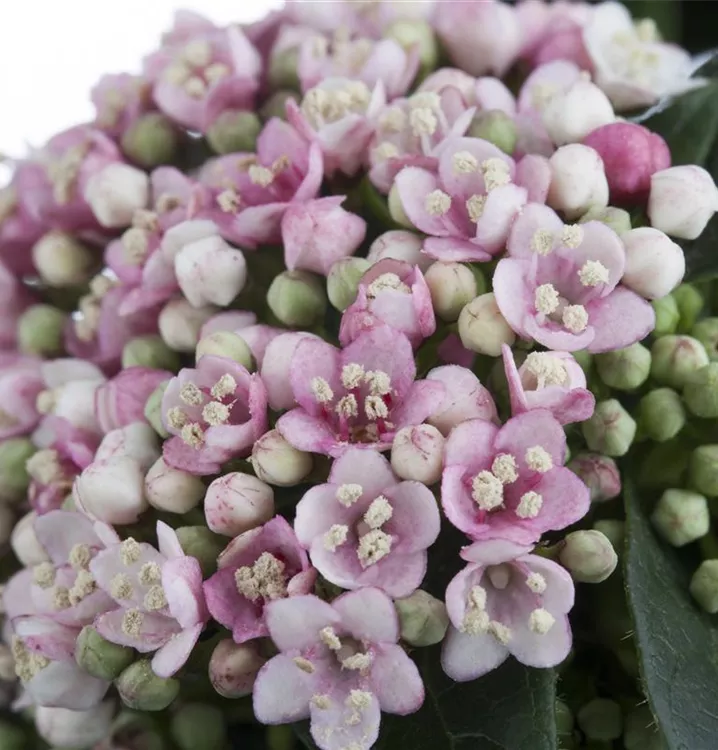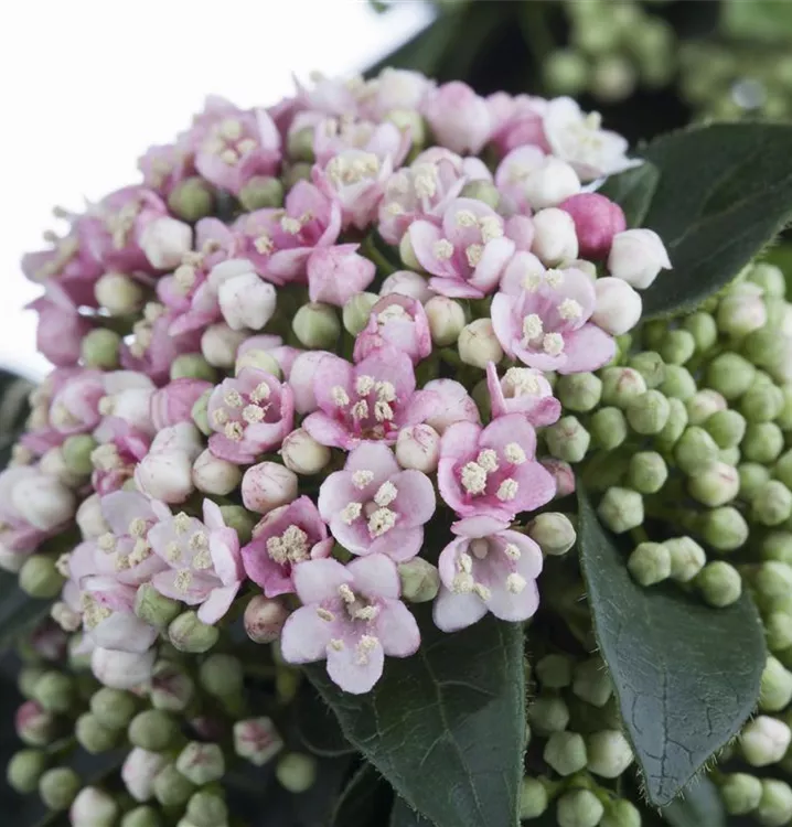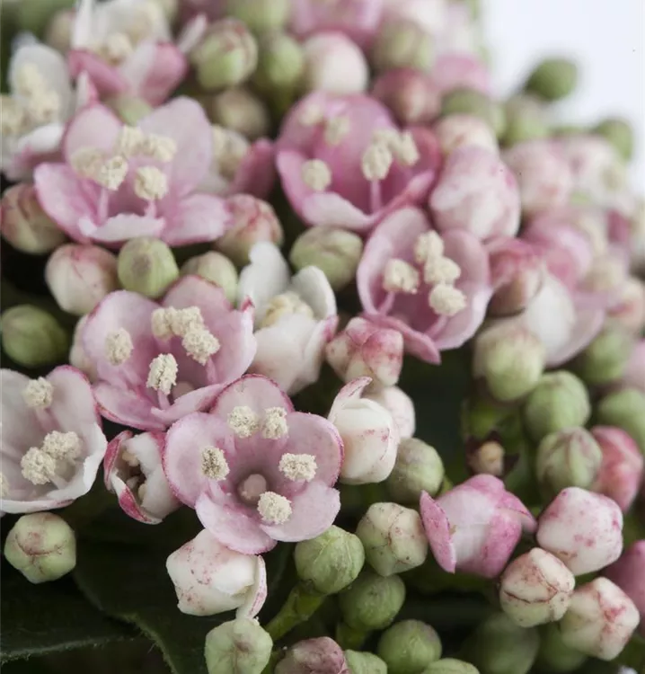 Die hellrosafarbenen Blüten des Lorbeer-Schneeball erscheinen in Schirmtrauben von März bis April. Diese sind leicht duftend. Bei richtiger Pflege Nachblüte im November.