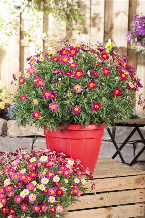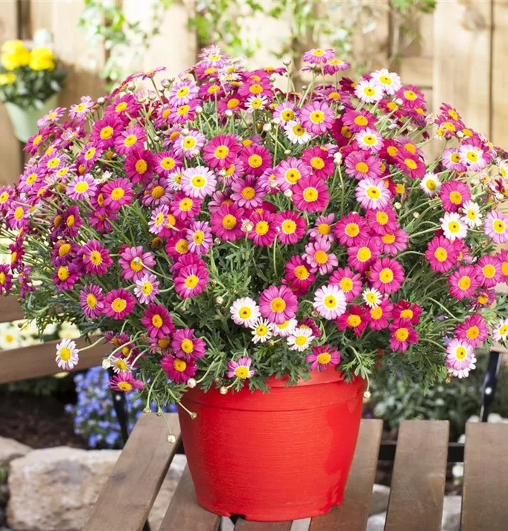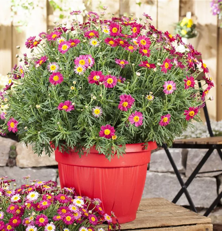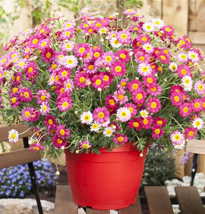 Die Strauchmargerite (Argyranthemum frutescens) ist eine beliebte Pflanze für den Balkon, die während der gesamten Saison unzählige rote Blüten bildet. Ein sonniger Standort und ein durchlässiges Substrat werden bevorzugt.