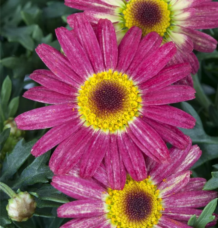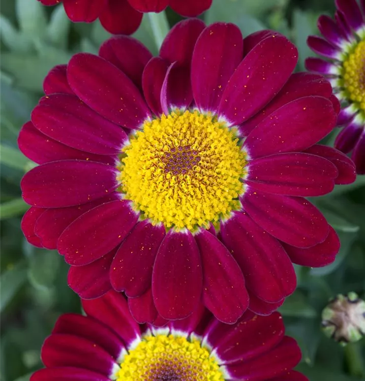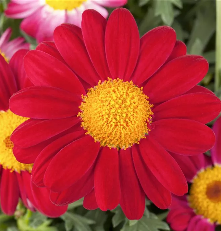 Argyranthemum frutescens, rot bildet während der gesamten Saison zahlreiche körbchenartige, rote Blüten.