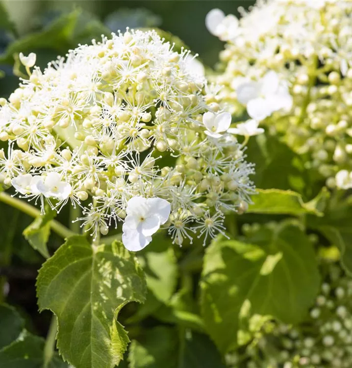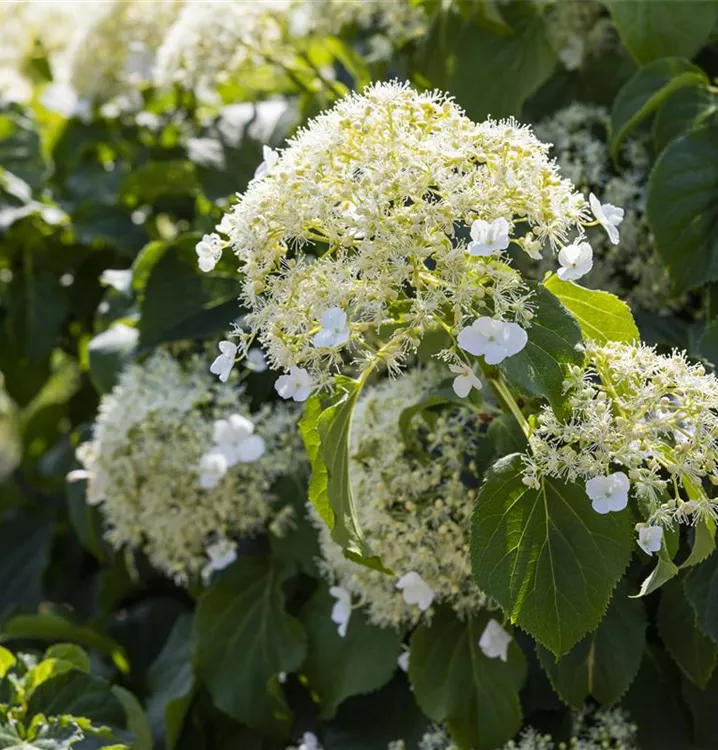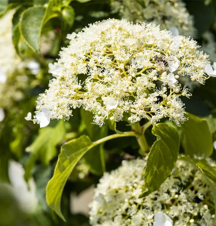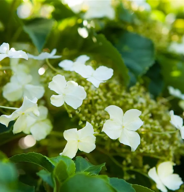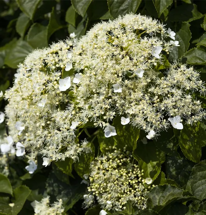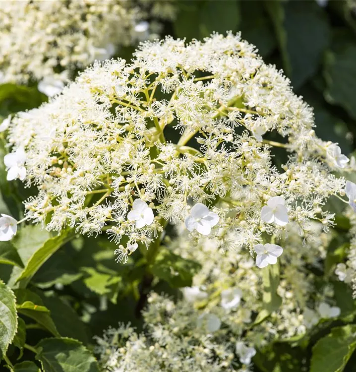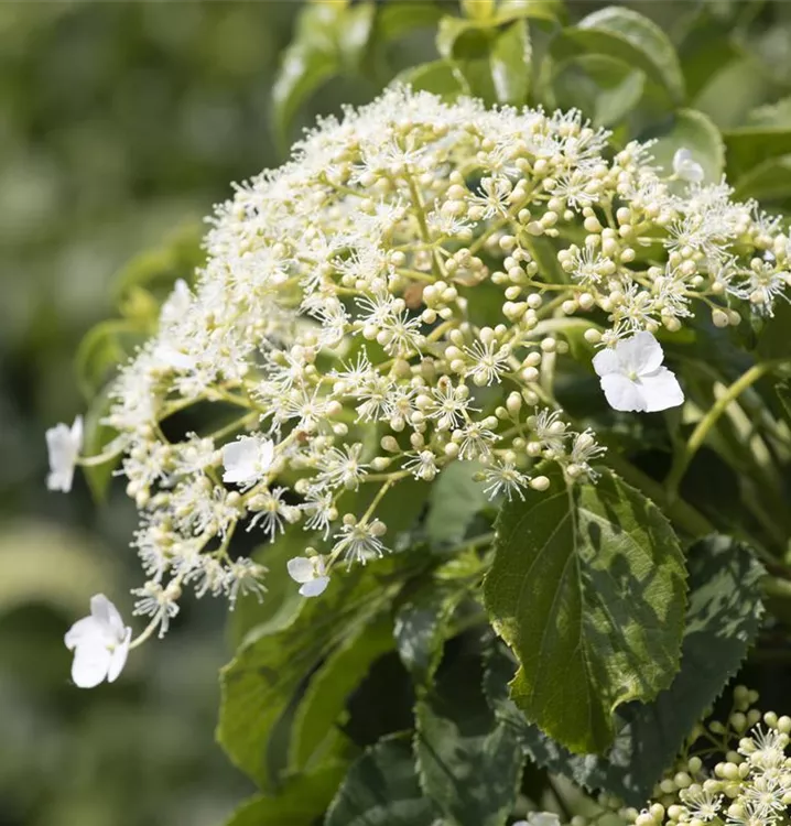 Die weißen Blüten der Kletterhortensie erscheinen in Rispen von Juni bis Juli. Diese sind angenehm duftend.