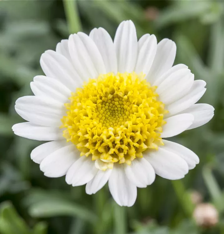 Argyranthemum frutescens, weiß bildet während der gesamten Saison zahlreiche körbchenartige, weiße Blüten.
