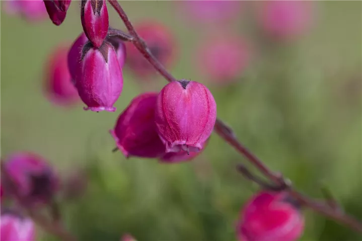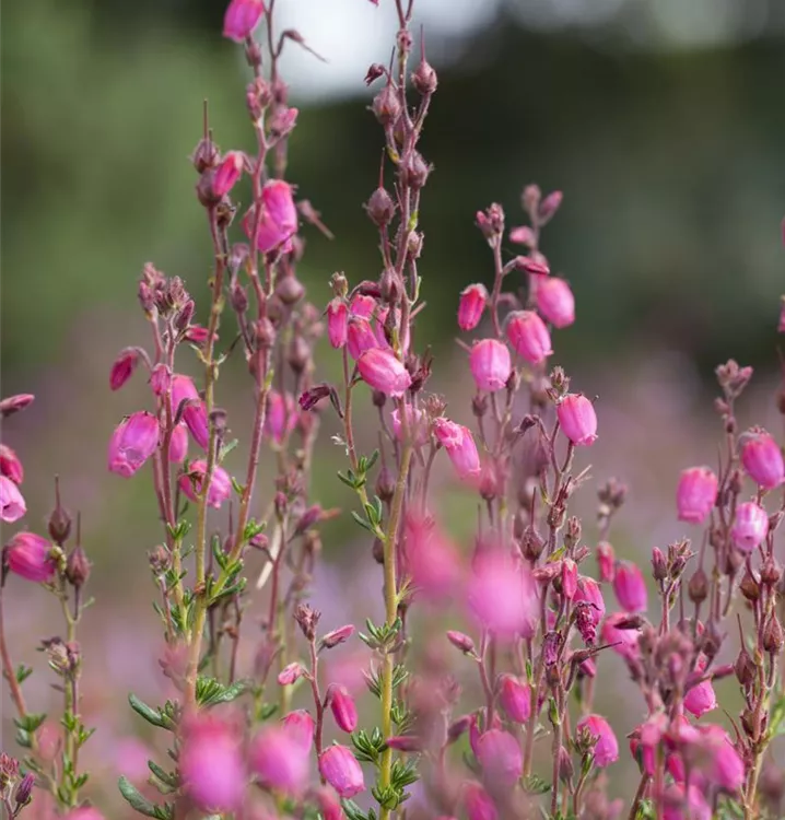 Die rosafarbenen, glockenförmigen Blüten der Irischen Heide erscheinen in Trauben von Juni bis Oktober. Diese werden etwa 1 cm groß.