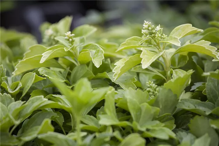 Das Dickmännchen (Pachysandra terminalis) ein ausläuferbildender, kriechender Halbstrauch, der, je nach Sorte, Blüten in verschiedenen Farben hervorbringt. An einem halbschattigen bis schattigen Standort mit humosem, lockerem Boden erreicht es gewöhnlich eine Höhe von ca. 30 cm und wird ca. 50 cm breit.
