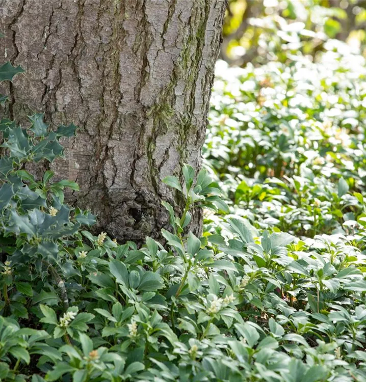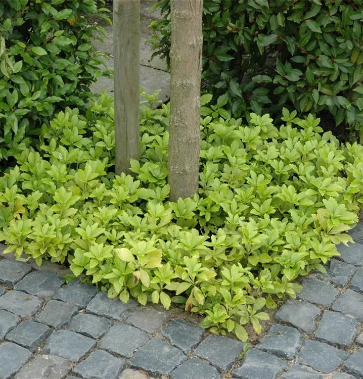 Pachysandra terminalis ist ein Flachwurzler und bildet, je nach Boden, ausladend verzweigte Wurzeln.