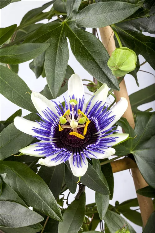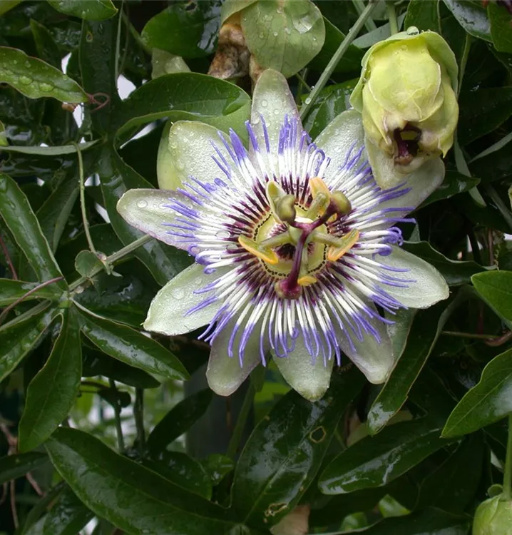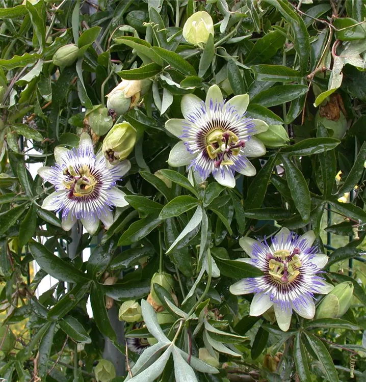 Blaue Passionsblume ist ein Klettergehölz, welches eine Höhe von 2 - 4 m und eine Breite von 0,6 - 1 m erreichen kann. In der Regel wächst sie 40 - 50 cm pro Jahr.