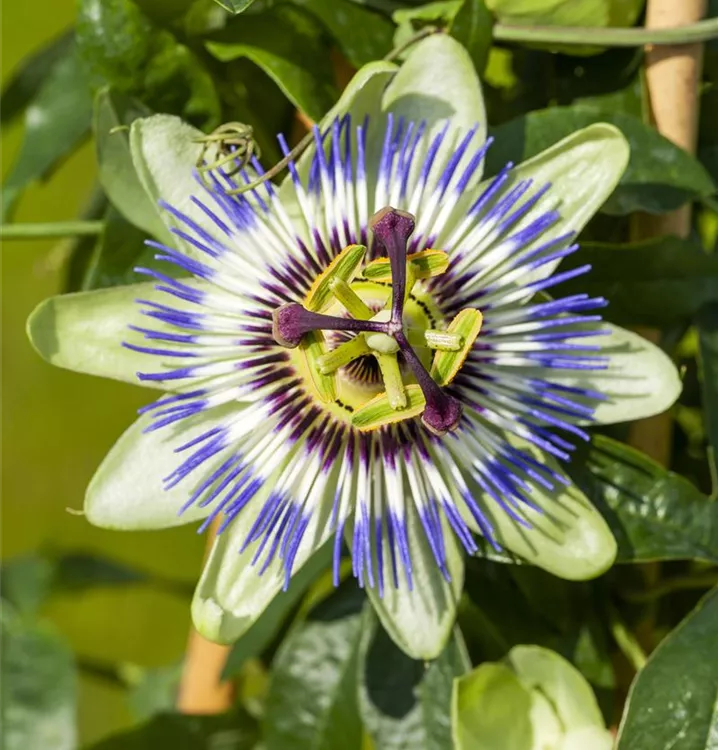 Die Blaue Passionsblume (Passiflora caerulea) eine kletternde Gartenpflanze, die, je nach Sorte, radförmige Blüten in verschiedenen Farben hervorbringt. An einem sonnigen bis halbschattigen Standort mit durchlässigem, humosem, nährstoffreichem Boden erreicht sie gewöhnlich eine Höhe von ca. 4 m und wird ca. 1 m breit.