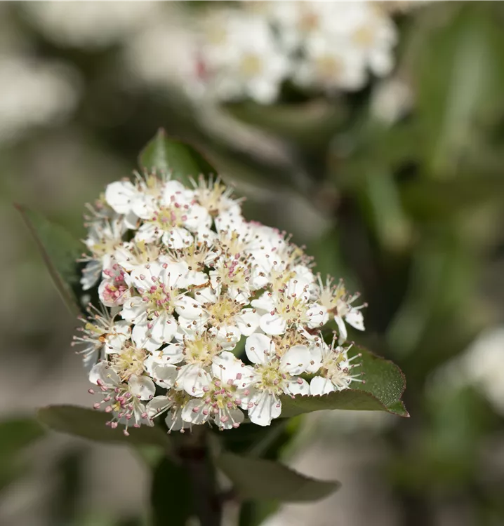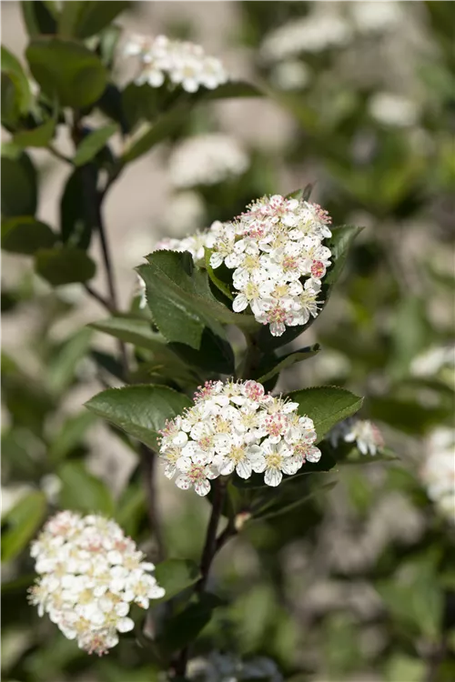 Aronia melanocarpa bildet in Rispen angeordnete, weiße Blüten ab Mai.