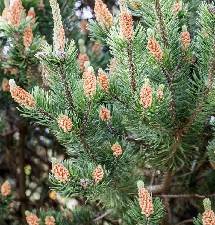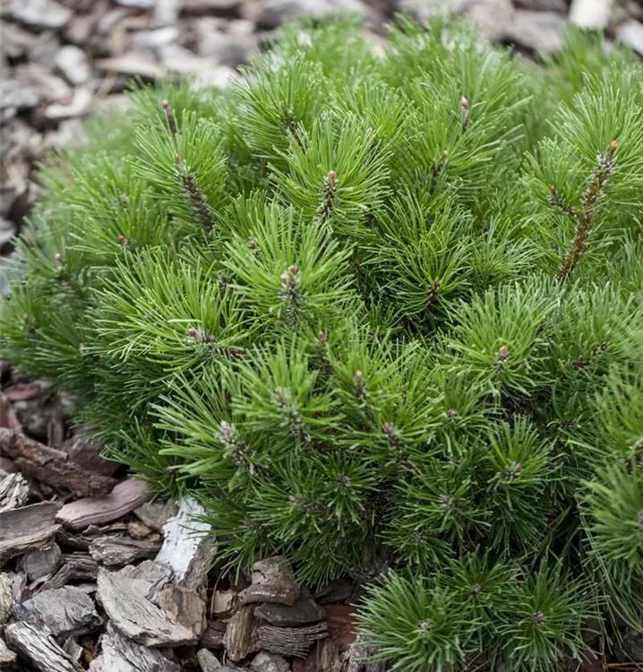 Die Krummholz-Kiefer (Pinus mugo) ist ein Strauch, welcher buschig, ausladend wächst und gewöhnlich eine Höhe von ca. 4 m und eine Breite von ca. 4 m erreicht. Ihre nadelförmigen Blätter haben eine mittelgrüne Färbung. Dekorative braun-gelbe Zapfen zieren Pinus mugo subsp. mughus ab Oktober. Dieses Gehölz ist gut frostverträglich. Sie bevorzugt einen sonnigen Standort. An den Boden stellt die Krummholz-Kiefer keine besonderen Ansprüche.