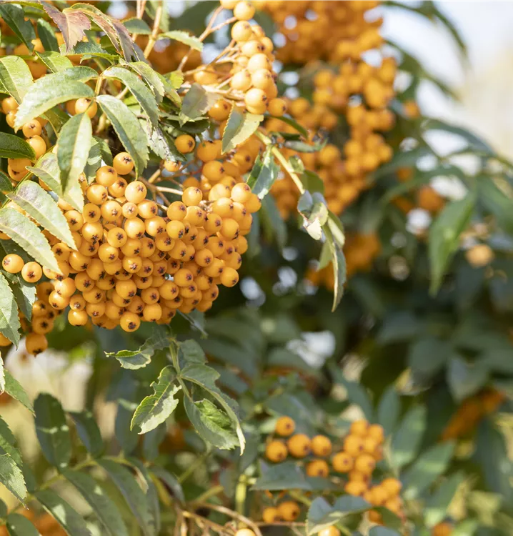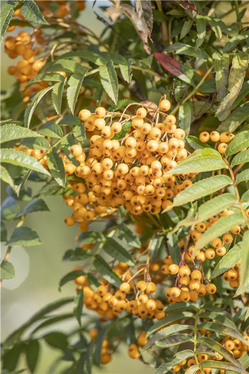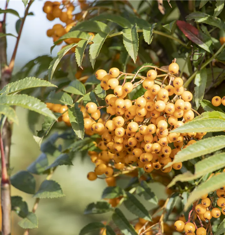 Besonders dekorativ sind die orangegelben, runden Früchte von Sorbus aucuparia 'Autumn Spire'®. Diese erscheinen ab August.