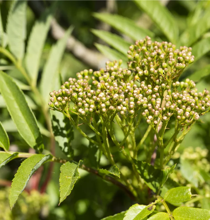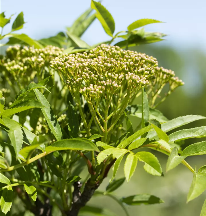 Die weißen Blüten der Eberesche 'Autumn Spire'® erscheinen in Rispen von Mai bis Juni.