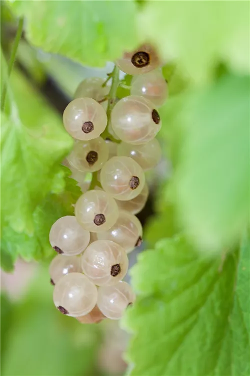Die Johannisbeere, weißfrüchtig (Ribes rubrum) bildet weiße Beeren. Diese sind süß-säuerlich im Geschmack. Für eine ertragreiche Ernte ab Juni schaffen durchlässiger, nährstoffreicher Boden und ein sonniger bis halbschattiger Standort optimale Bedingungen. Auch ihre grünen Blüten sind eine schöne Erscheinung.