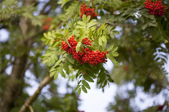 Besonders dekorativ sind die orange-roten, runden Früchte von Sorbus aucuparia 'Edulis'. Diese erscheinen ab August.