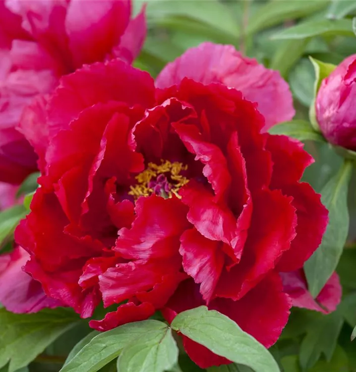 Paeonia lactiflora, rot bildet gefüllte, schalenförmige, rote Blüten ab Mai. Diese verströmen einen angenehmen Duft.