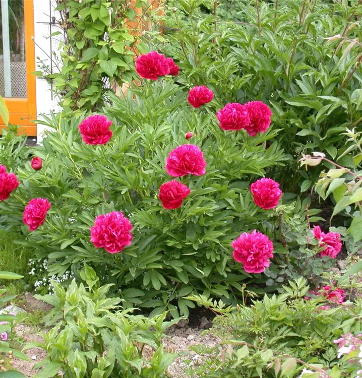 Die Asiatische Pfingstrose (Paeonia lactiflora) ist eine aufrechte, ausladende Staude, die von Mai bis Juni rote, schalenförmige Blüten mit einem angenehmen Duft bildet. An einem sonnigen Standort mit humosem, nährstoffreichem, lehmigem Boden erreicht sie gewöhnlich eine Höhe von ca. 1 m und wird ca. 1 m breit. Die Asiatische Pfingstrose ist gut frostverträglich.