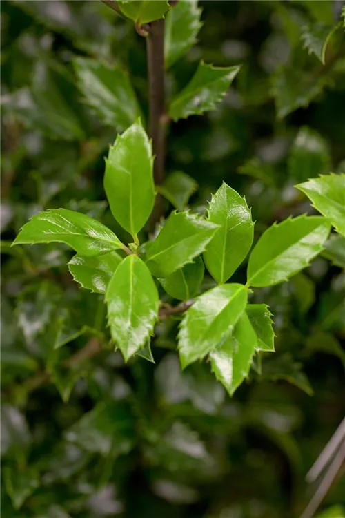 Die immergrünen Blätter der Stechpalme 'Heckenstar'(s) sind dunkelgrün, lanzettlich, glänzend, wechselständig, gezähnt.